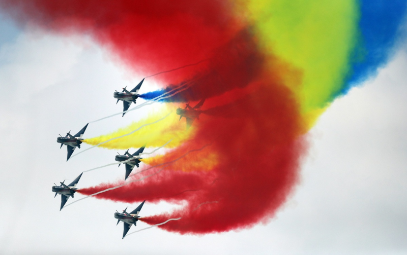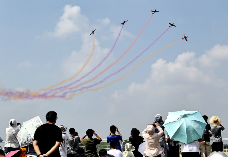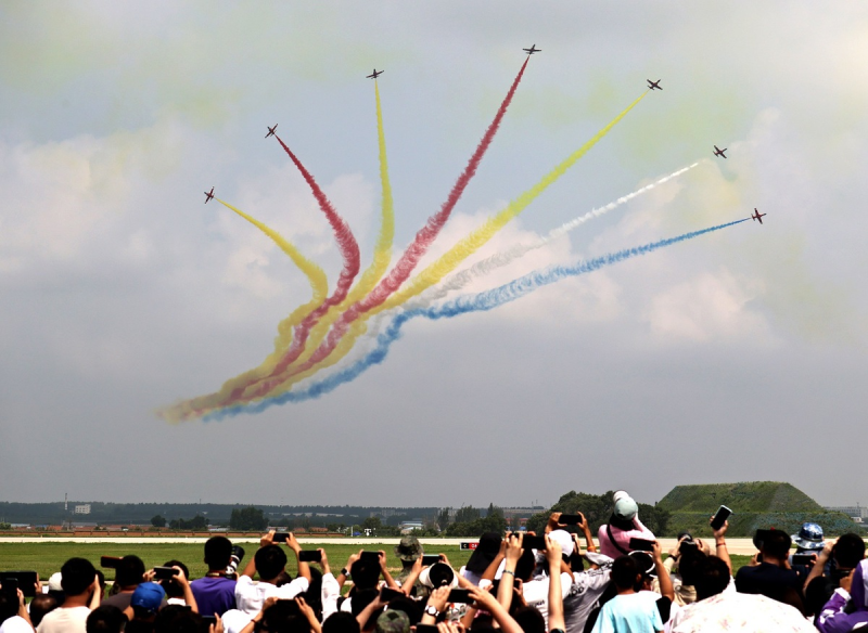 Each time the planes conducted a breathtaking maneuver, the crowd cheered and applauded, the din competing with the sound of camera shutters clicking furiously. The event is being held at the PLA Air Force Aviation University in Changchun.