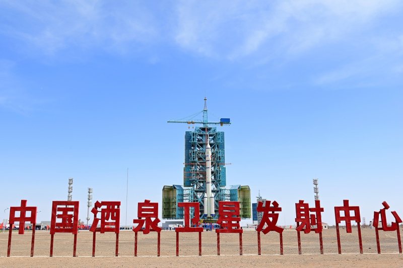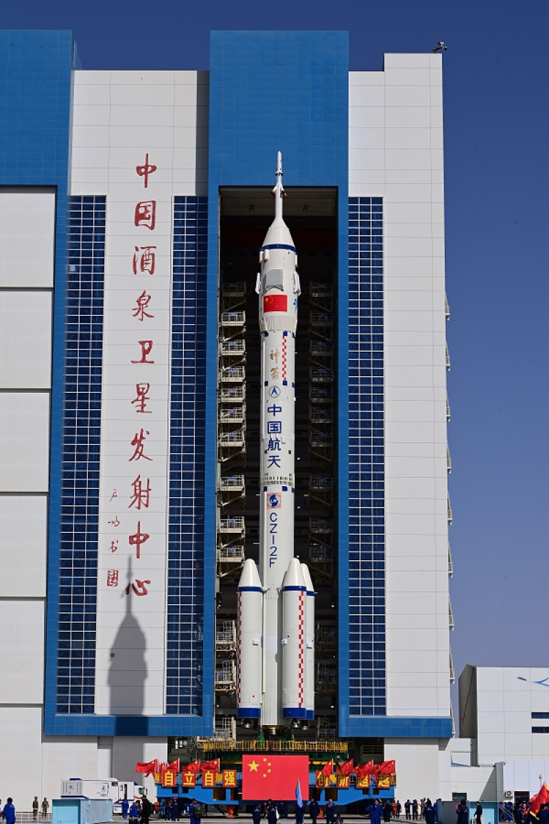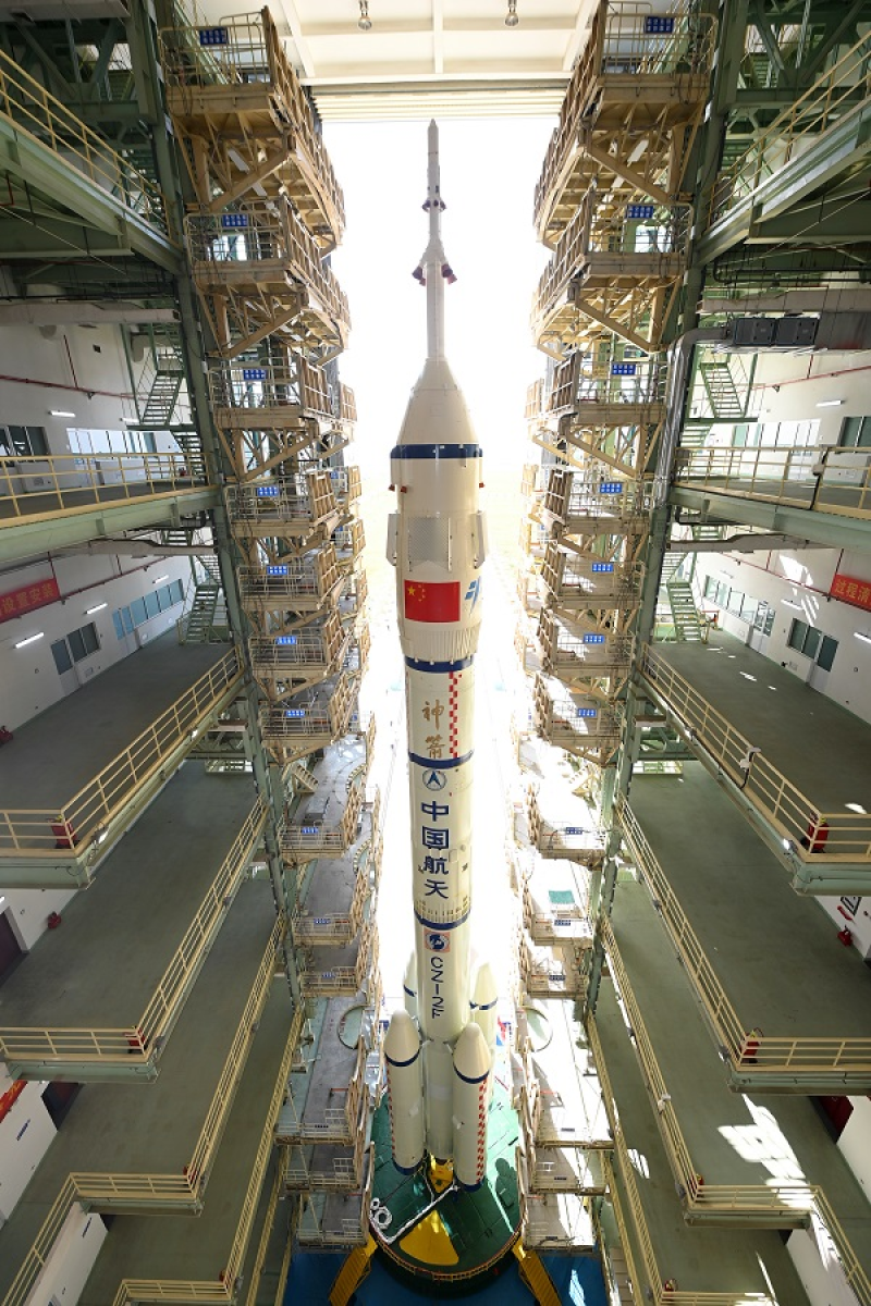 The Shenzhou XVIII spacecraft and its carrier, a Long March 2F rocket, are moved to the service tower at the Jiuquan Satellite Launch Center in northwestern China's Gobi Desert, April 17, 2024. [Photo by Wang Jiangbo/For chinadaily.com.cn]