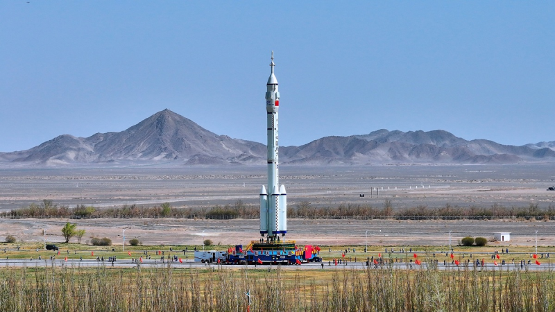 The Shenzhou XVIII spacecraft and its carrier, a Long March 2F rocket, are moved to the service tower at the Jiuquan Satellite Launch Center in northwestern China's Gobi Desert, April 17, 2024. [Photo by Wang Heng/For chinadaily.com.cn]