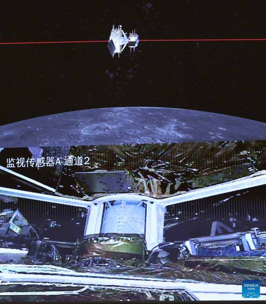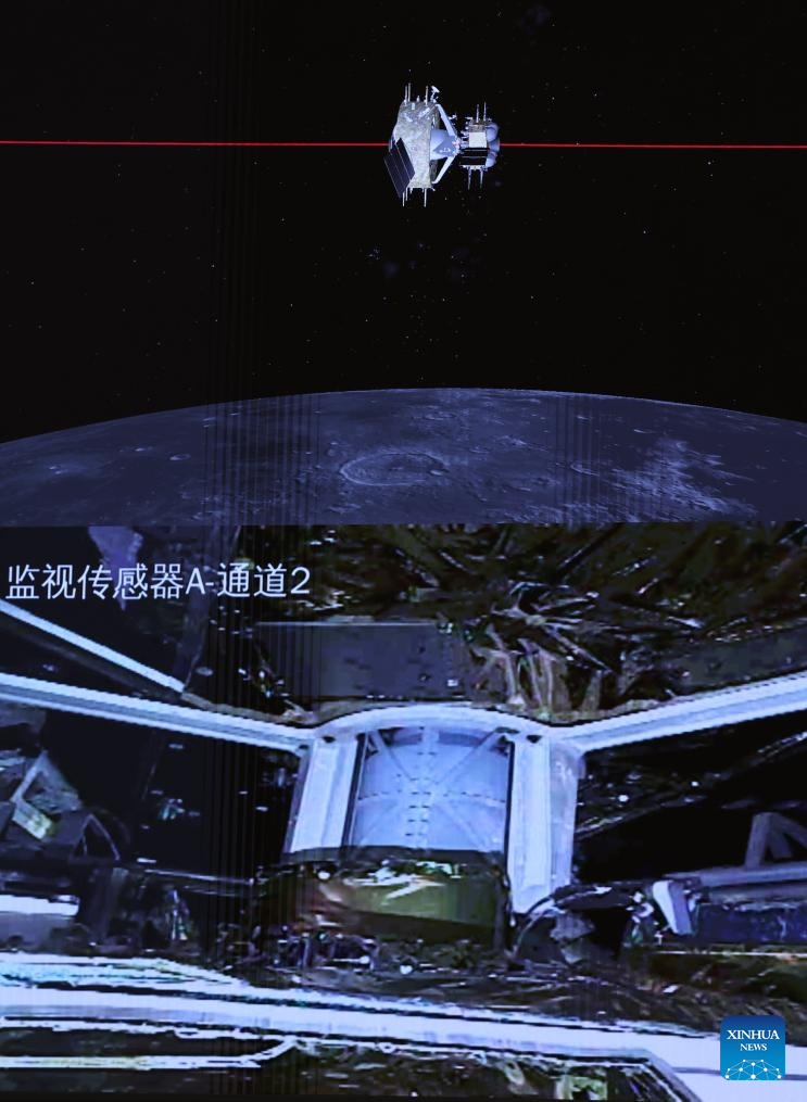 This image taken at Beijing Aerospace Control Center (BACC) on June 6, 2024 shows the ascender of China's Chang'e-6 probe rendezvousing and docking with the probe's orbiter-returner combination in lunar orbit. (Xinhua/Jin Liwang)