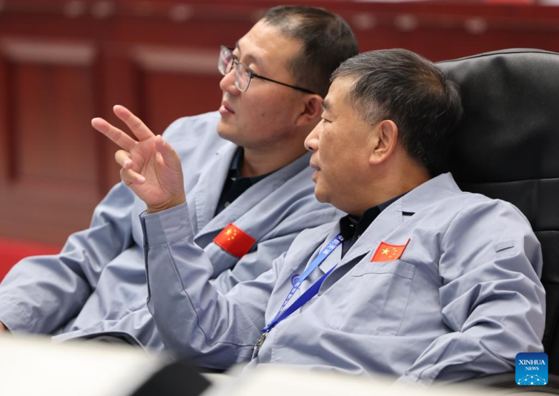 Hu Hao (R), chief designer of China's Chang'e-6 mission, and Guan Feng, director of the Lunar Exploration and Space Engineering Center of China National Space Administration, communicates at the Beijing Aerospace Control Center (BACC) in Beijing, capital of China, June 6, 2024. (Xinhua/Jin Liwang)